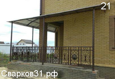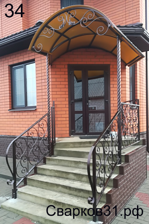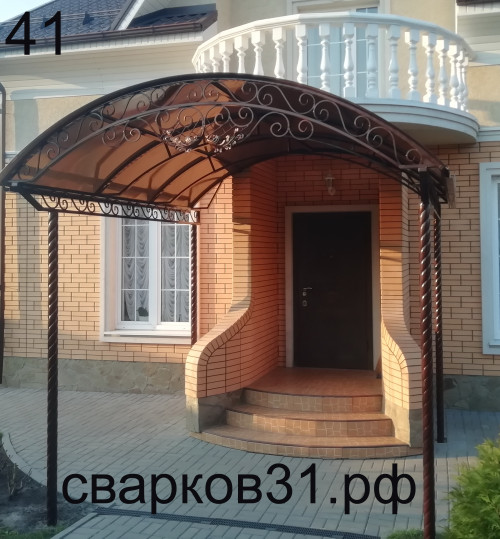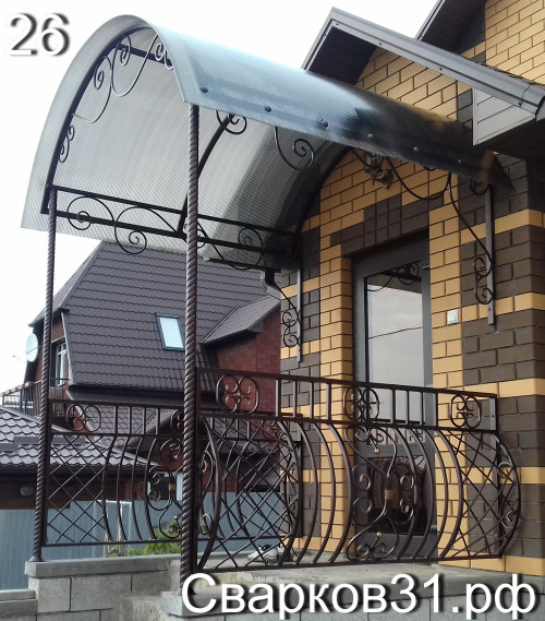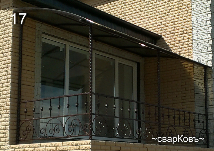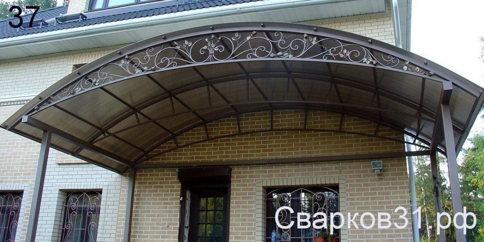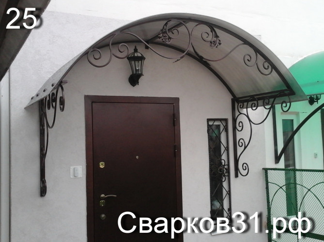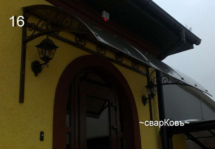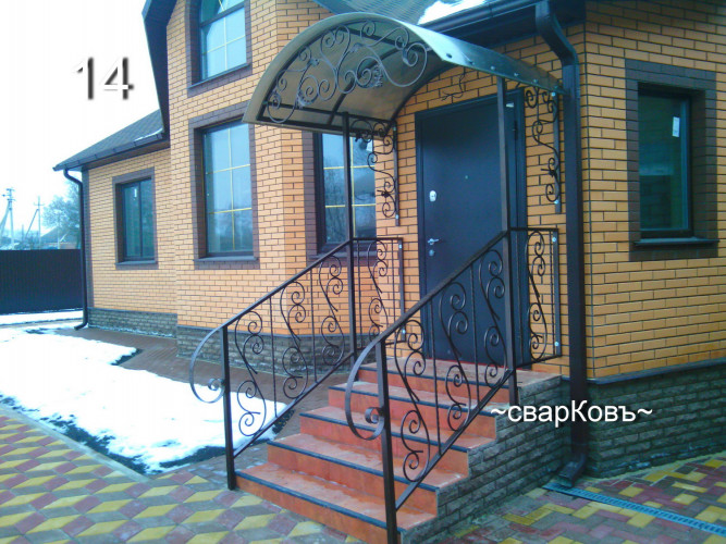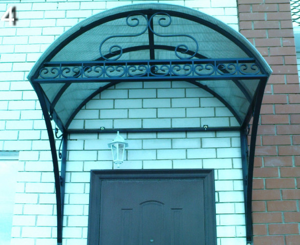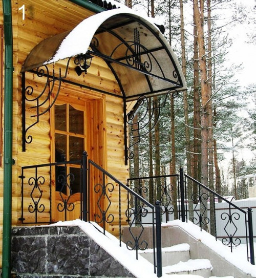 - Кованые козырьки над входом в дом. Небольшие конструкции, защищающие крыльцо от атмосферных осадков и придающие фасаду большей эстетики. В качестве настила может использоваться металлический либо поликарбонатный лист.