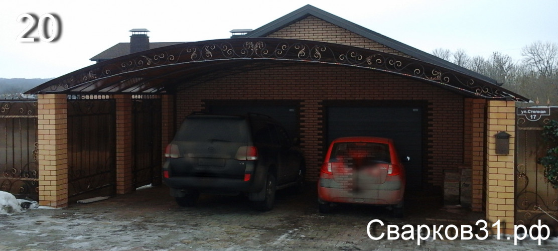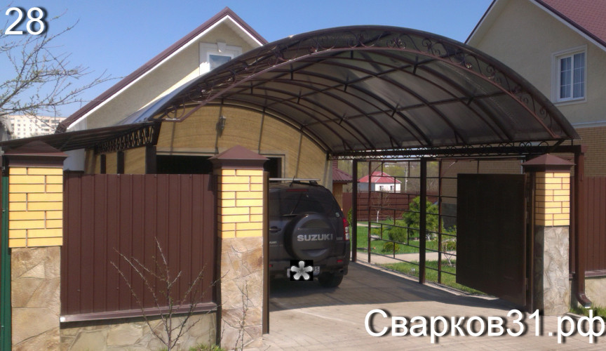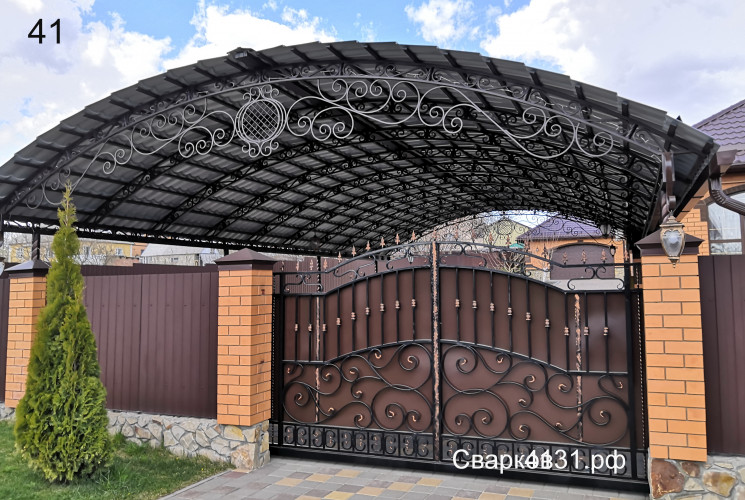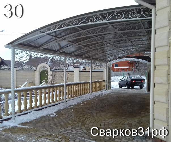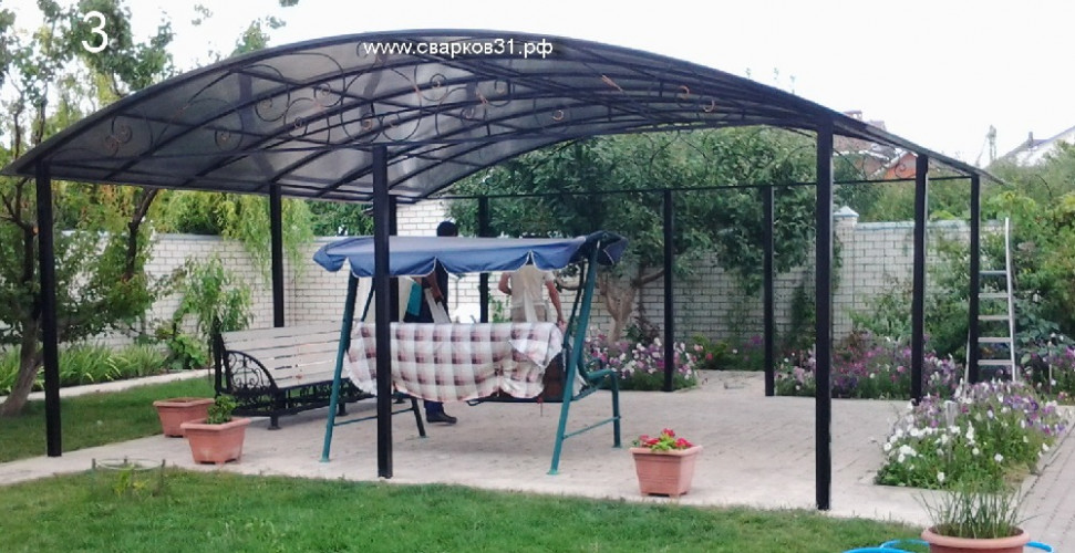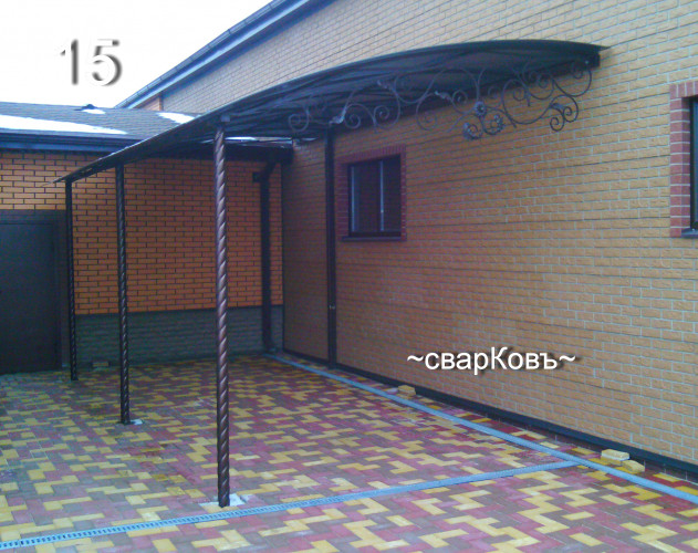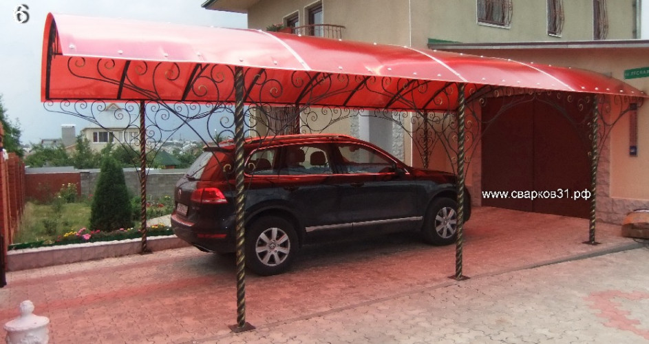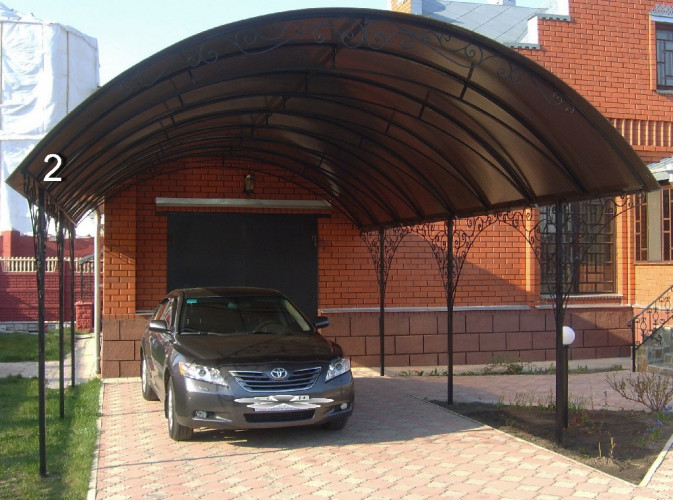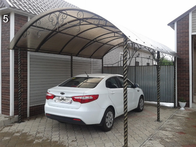 - Навесы. Металлические конструкции, которые давно стали отличной альтернативой гаражу. Одна часть монтируется к торцу дома, другая – на металлических опорах. Также навесы широко используются на приусадебных участках, для организации беседки. В производстве применяется художественная ковка, а также листы поликарбоната (нескольких расцветок).