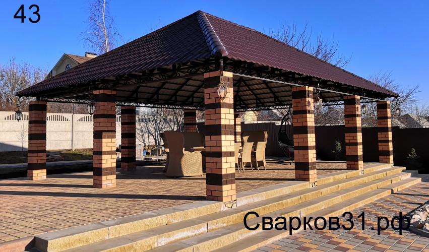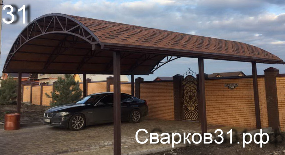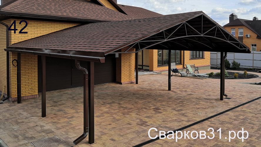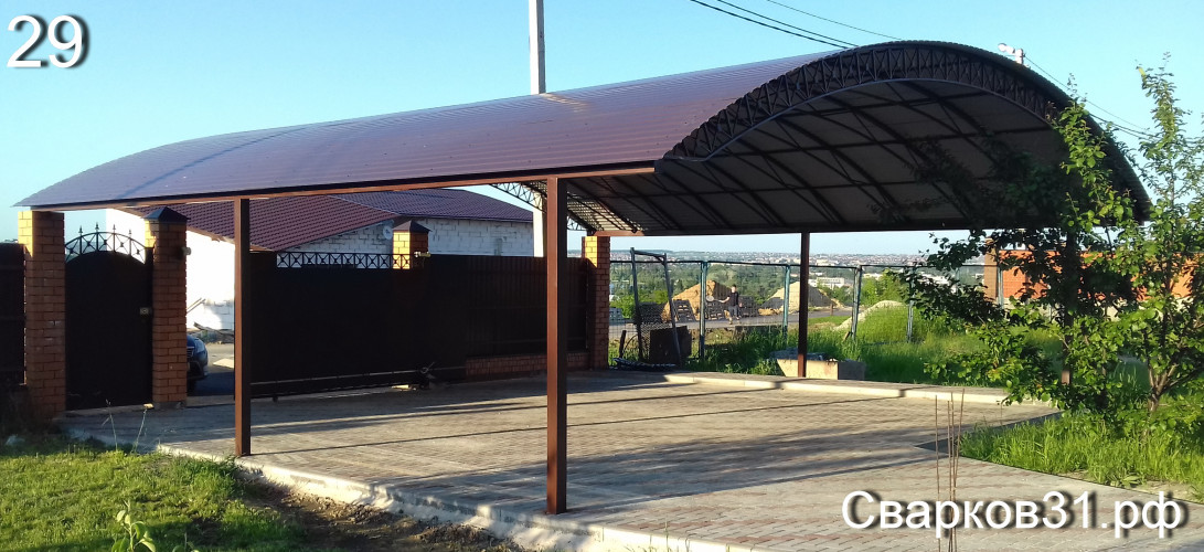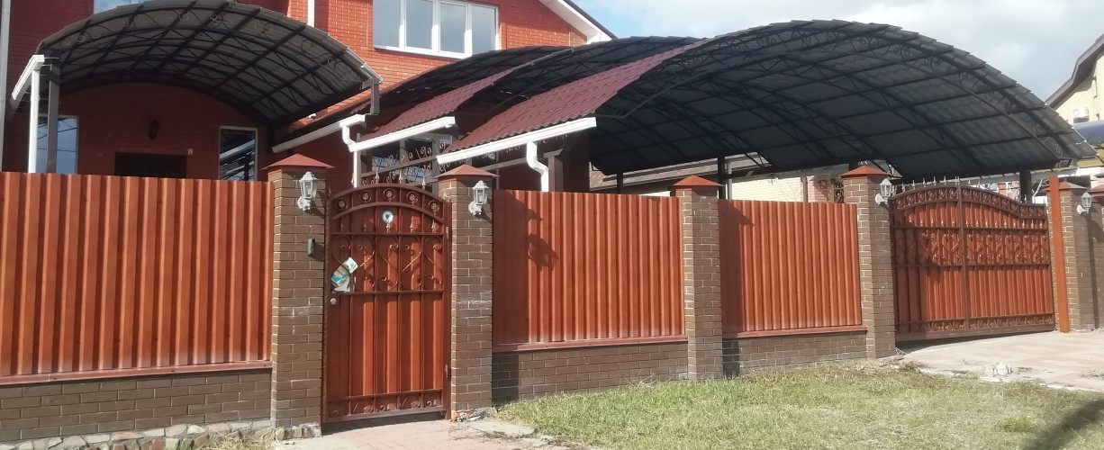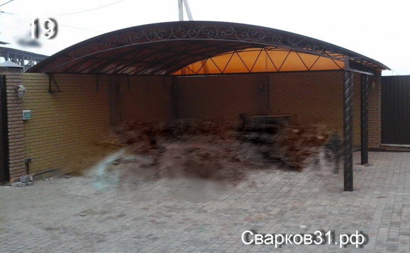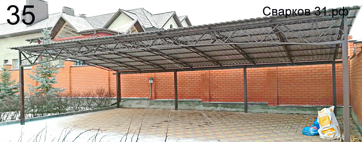 - Навесы. Металлические конструкции, которые давно стали отличной альтернативой гаражу. Одна часть монтируется к торцу дома, другая – на металлических опорах. Также навесы широко используются на приусадебных участках, для организации беседки. В производстве применяется художественная ковка, а также листы поликарбоната (нескольких расцветок).